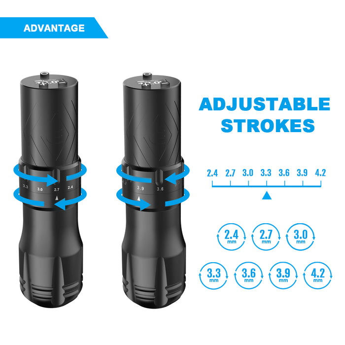 EMALLA GRAND with a continuously adjustable stroke from 2.4mm to 4.2mm - total 7 strokes (2.4mm/2.7mm/3.0mm/3.3mm/3.6mm/3.9mm/4.2mm) Switching between different strokes will be much easier! Perfect for all tattoo styles.